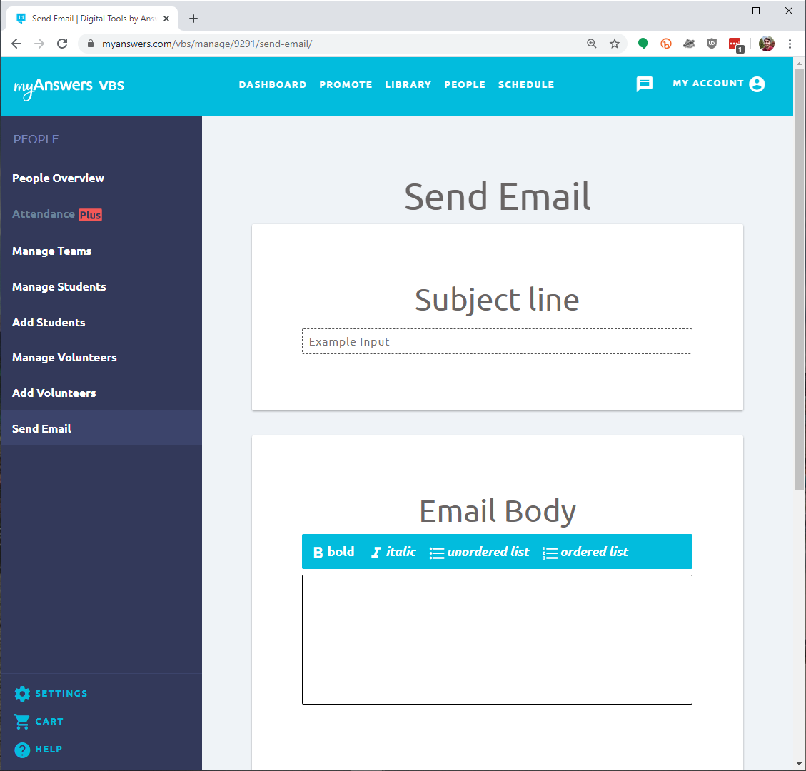 Yes! VBS Digital allows for sending custom emails from within the platform. To get to the email interface, click the "People" header link, then click "Send Email" on the left sidebar. You will be able to edit the subject, body, and select your recipients from the pool of registered volunteers and parents.